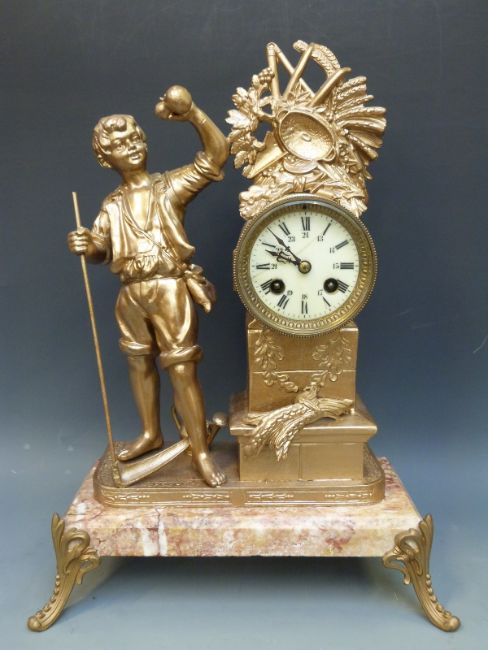 19thC French ormolu style clock, the Roman ivory coloured enamelled dial with Arabic minutes and beetle and poker hands, the drum case with reeded decoration, the movement stamped Paris 92736-70 striking on a bell, decorated with a farm lad with scythe and sheaves of corn, raised on a marble base and metal feet, 42.5cm