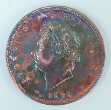 George IV penny 1826 laureate head obverse, Britannia with shield and trident rear, toned with a little lustre, VF - EF but scratch to cheek of bust