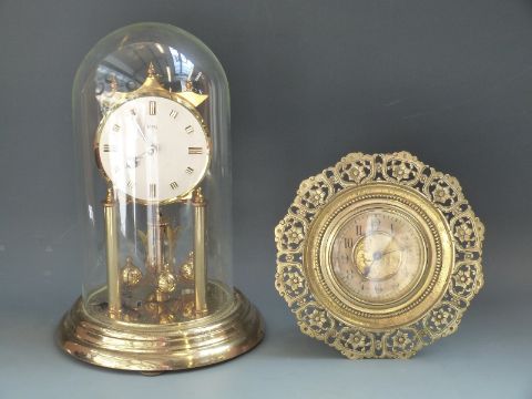A c1910 circular brass easel clock, the Arabic chapter ring surrounding gilt classical scene depicting nude figure with lyre by a lake and castle, the brass case surround with pierced floral decoration, 19cm diameter overall, together with a Koma anniversary clock