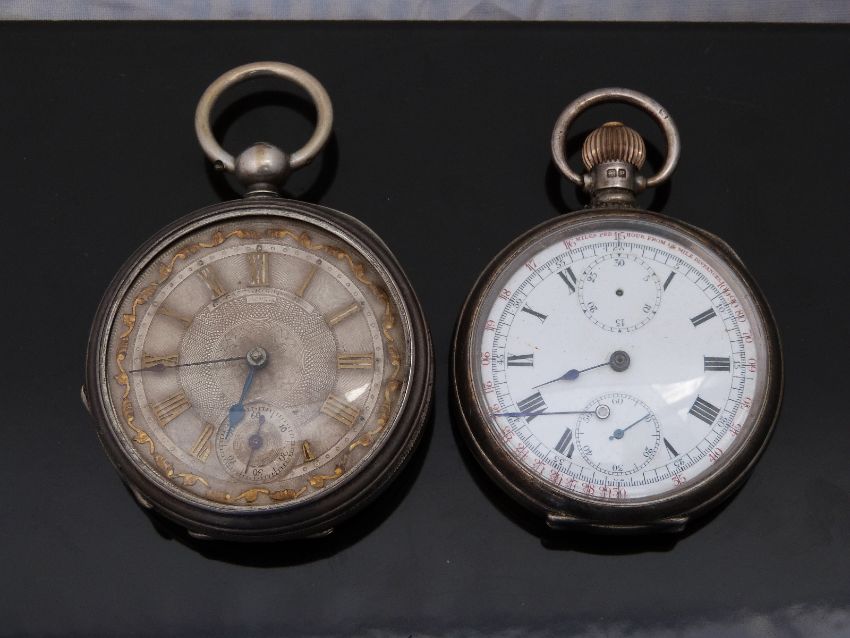 Two gentleman's open faced pocket watches comprising a hallmarked silver example with tachymetre scale, inset subsidiary dials and white enamel face and a white metal example with gilt highlighted self coloured face and engraved case, largest case diameter 52mm.