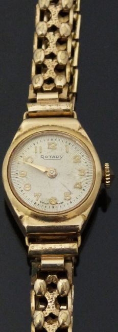 Rotary 9ct gold ladies wristwatch with gold hands and Arabic numerals, sunburst engraved face and Perret 17 jewel calibre 1051 movement, on rolled gold bracelet, case diameter 17.5mm, serial number 0152697.