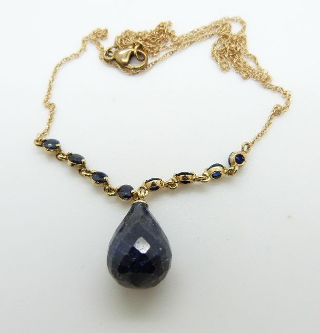 A 9ct gold necklace set with a briolette cut sapphire and eight round cut sapphires to the chain, 4.9g