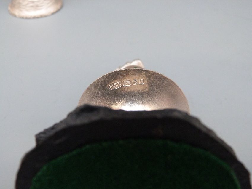 Hallmarked silver and silver gilt novelty surprise Easter mushroom opening to reveal a leprechaun cutting down a bejewelled Easter egg tree whilst another leprechaun is still painting the top, on slate base, London 1984 maker Christopher Nigel Lawrence (Liveryman of the Worshipful Company of Goldsmiths), 13cm tall
