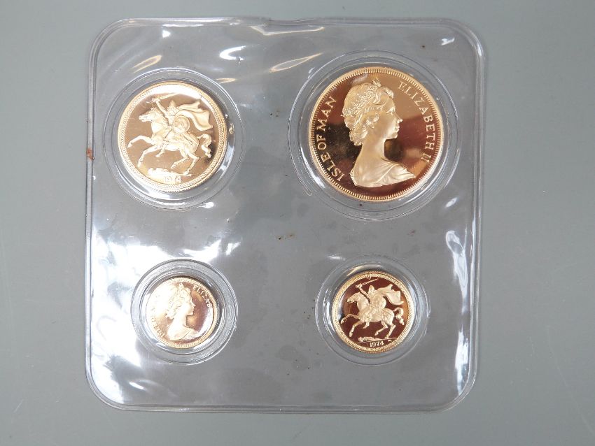 Pobjoy Mint limited edition 2353/2500 22ct gold 1974 coin set comprising £5 and two £1 gold full pieces, sovereign and half sovereign, uncirculated in original plastic wrap, in box with certificate