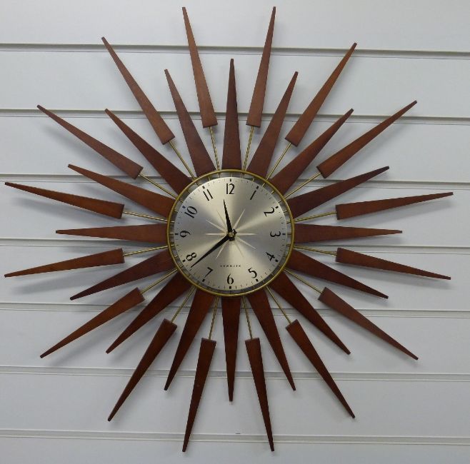 Newgate 1950's style 'sunburst' wall clock with Arabic numerals on brushed aluminium dial, mahogany finish, 68cm diameter