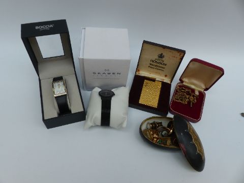 A collection of costume jewellery to include garnet, rose quartz, peridot, amethyst beaded necklaces, pearl necklace, tiger's eye bracelet, Ronson lighter, multi-coloured pearl necklaces, cufflinks, brooches, Skagen watch etc