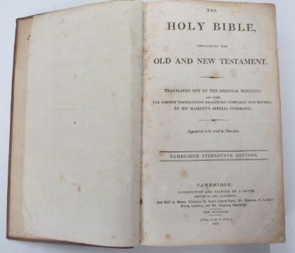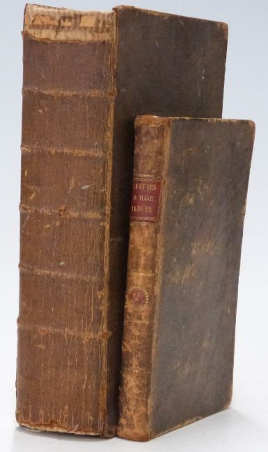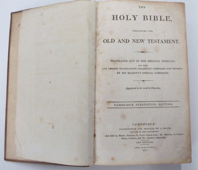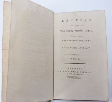 Letters Addressed to Two Young Married Ladies on the Most Interesting Subjects, printed for J. Dodsley 1782 volume 2 bound in full calf with gilt lettered leather label with copy of The Holy Bible containing the Old And New Testament printed by J. Smith 1815 leather with blind stamped lettering and raised bands