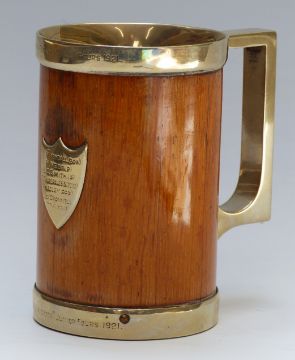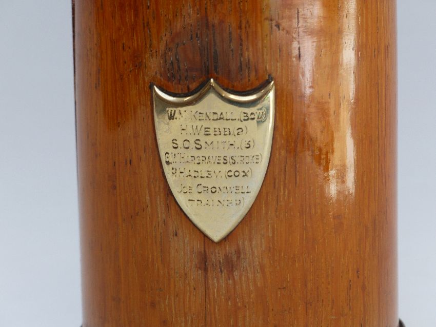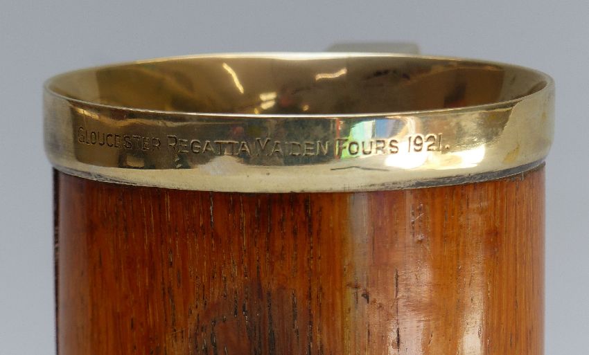 Gloucester and Worcester rowing club interest treen tankard with plated mounts engraved Gloucester Regatta Maiden Fours & Worcester Regatta Junior Fours 1921 etc, H14cm