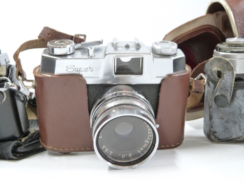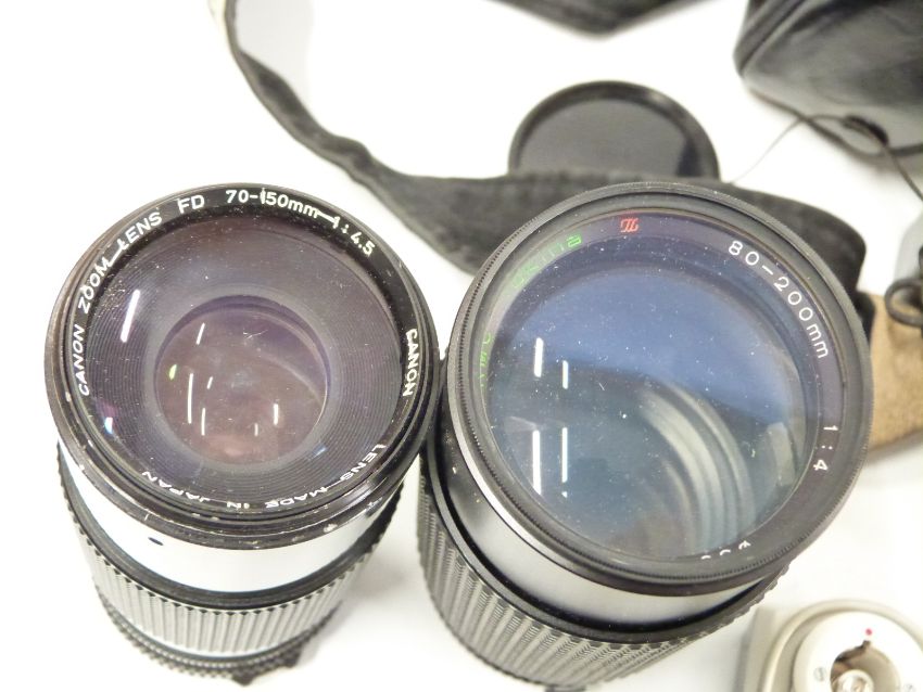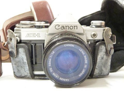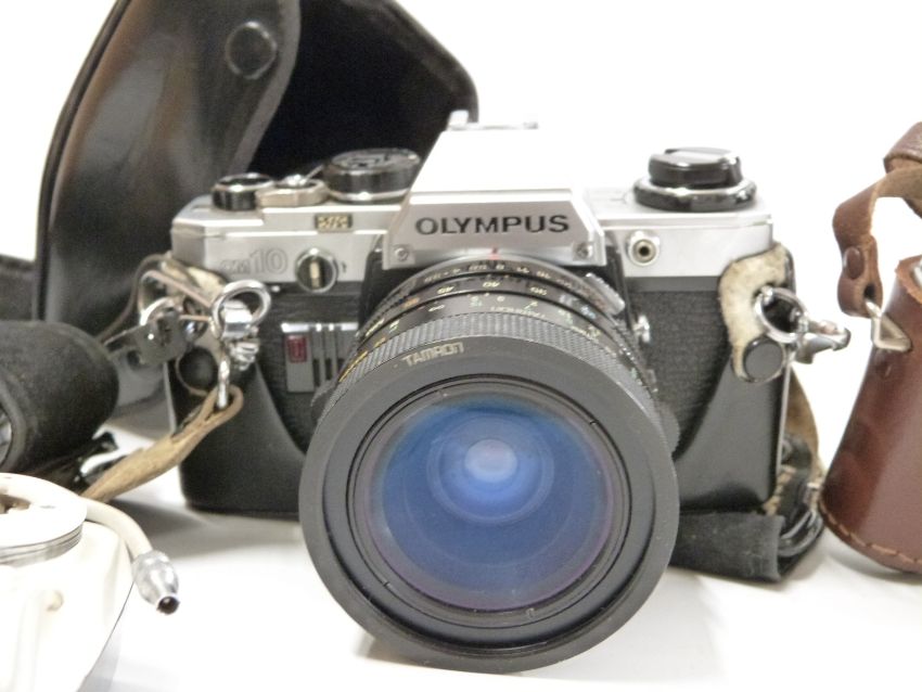 Olympus OM10 with Tamron 1:3.5-4.5 28-50mm lens, Canon AE1 with 50mm 1:1.8 lens, Tokina 80-200mm 1:4 and Canon 70-150mm 1:4.5 lenses, Halina 35X camera, flash gun etc