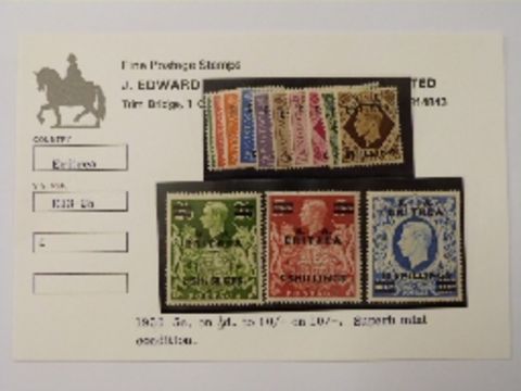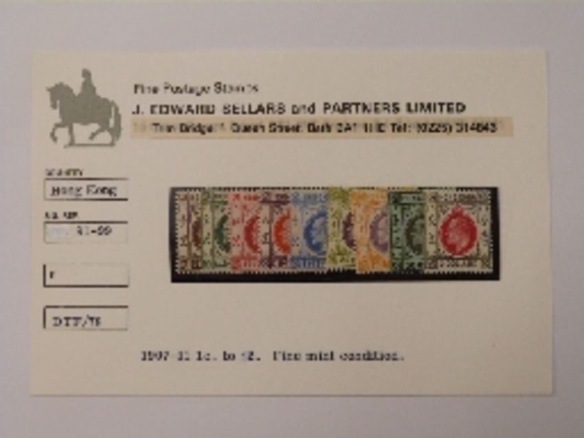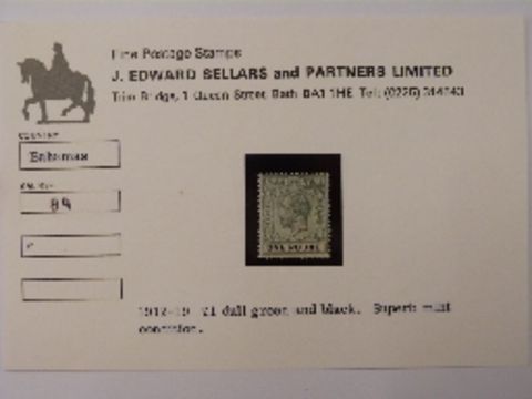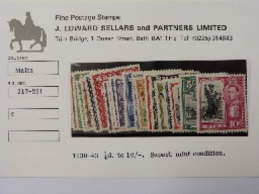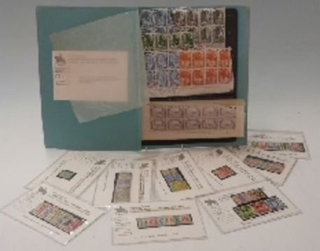 A selection of Commonwealth sets and single stamps still in original dealers' display cards as purchased, Cyprus 1938 - 51 1/4 pi to £1 excluding SG152a, 155ab and 156b.U.M, Grenada 1951 set 1/2c to $2.50, SG172 - 184 M Falkland Islands 1904 5/- SG58 superb used. Dominica 1908 - 21 part set 21/2d to 5/- SG50 - 54. M.St Kitts-Nevis 1920 - 22 set to 10/- SG24-35.M.Bahamas 1912-19 £1 dull green and black SG89.UM. Malta 1938 - 43 set to 10/- SG 217-231.UM. Hong Kong 1907 - 11 1c to $2 SG91 - 99.M. Eritrea 1950 5c on 1/2d to 10/- on 10/- SGE13-25.UM. Aden / Shihr and Mukalla 1955 5c to 10/- SG29 - 40 lower value blocks of 8, higher value blocks of 10.UM. Catalogue value £1900+