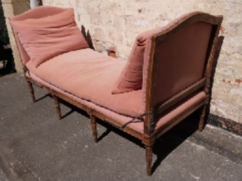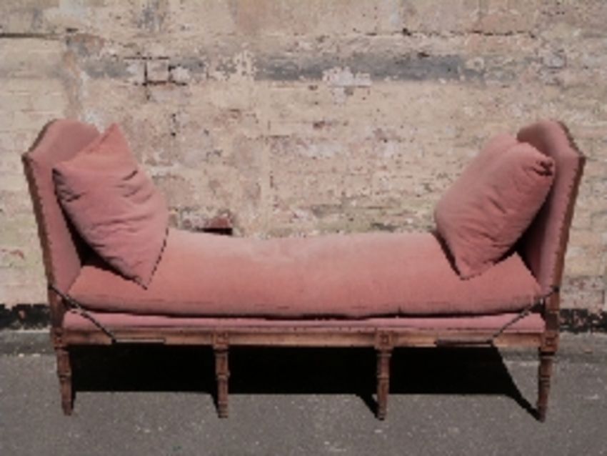 An upholstered hardwood day bed with drop ends raised on eight legs, W198 x D68 x H104cm
