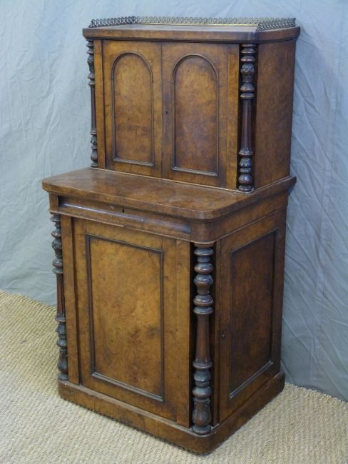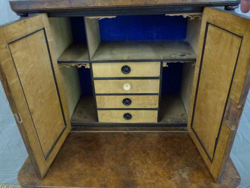 A 19thC burr walnut desk or library cabinet, the top opening to reveal bird's eye maple drawers, the base fitted four further drawers behind a cupboard door, W59 x D48 x H130cm