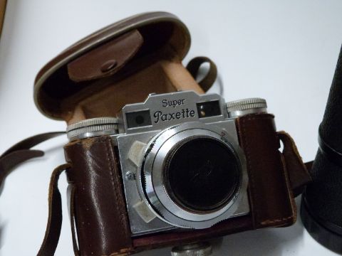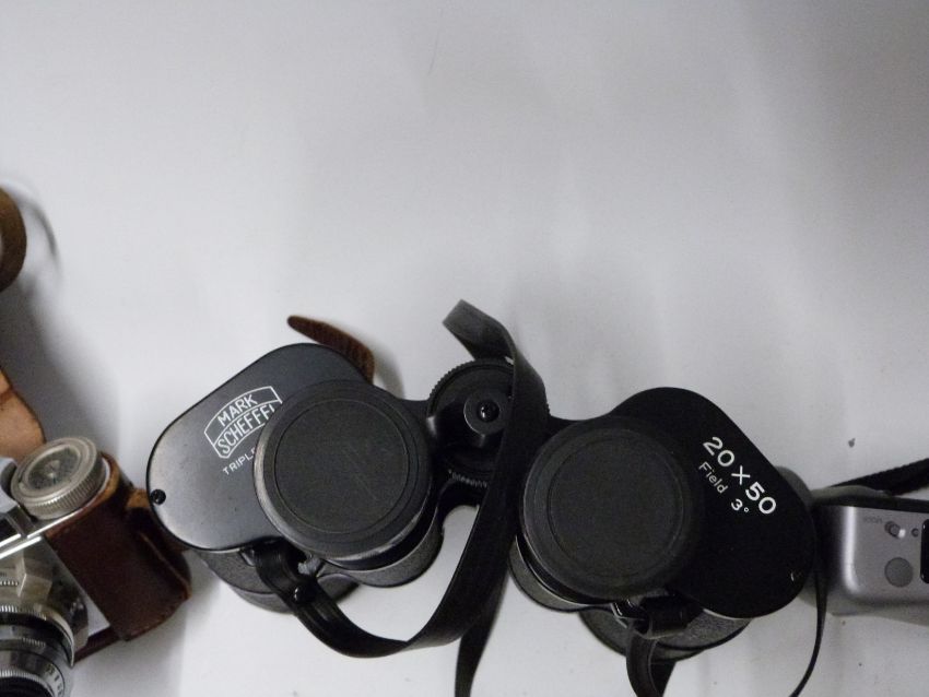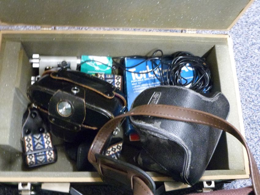 A quantity of cameras, photographic accessories etc including Braun Super Paxette camera, Mark Scheffel 20x50 binoculars, three draw telescope, teleconverter, Dollond range finder, tripod, cases etc