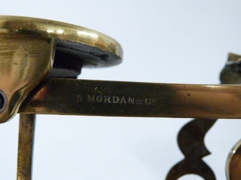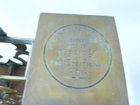 S Mordan & Co brass postage scales with weights to base and rates to pan