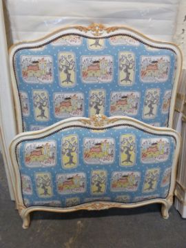 French single bed with painted vintage pine head and foot board, upholstered in vintage hand blocked fabric, W95cm