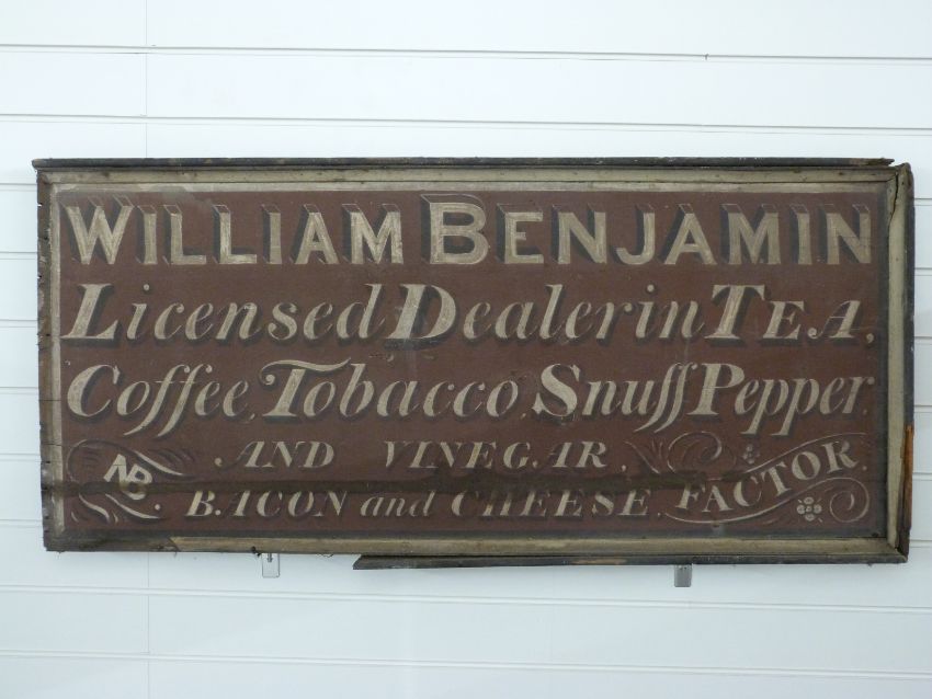Vintage hand painted wooden sign 'William Benjamin, Licensed Dealers in Tea, Coffee, Tobacco, Snuff Pepper and Vinegar'. Benjamin is believed to have traded from Dursley/Wotton-under-Edge or possibly Nailsworth, 58 x 123cm