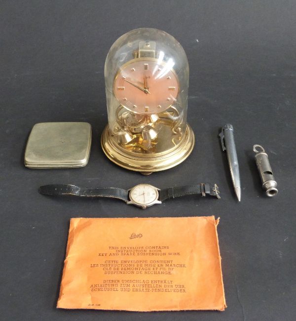 1945 Hudson military whistle, Ronson lighter pen, cigarette case, Fero wristwatch, clock, etc
