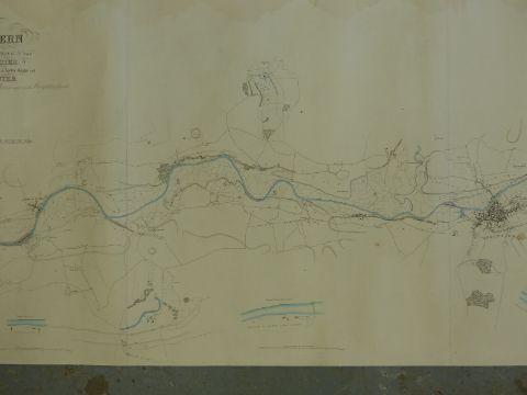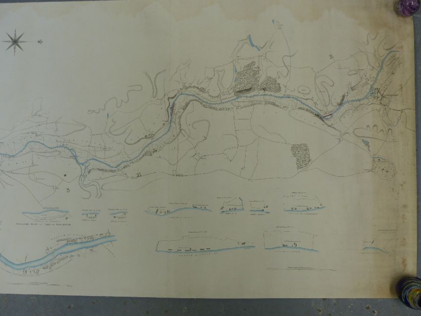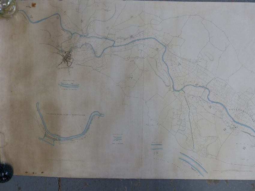 Thomas Rhodes map of the River Severn from Gloucester to Worcester extending from Near the Lower Parting in the County of Gloucester to Gladder or Whitehouse Brook within the Parish of Arley Kings in the County of Worcester, drawn for the Severn Navigation Company. The survey was engraved in London on 8 sheets by John Gardner and extends to a total length of nearly 5 metres, enhanced by a delicate wash colour. Scale 4inches to 1 mile. Published in 1837.