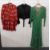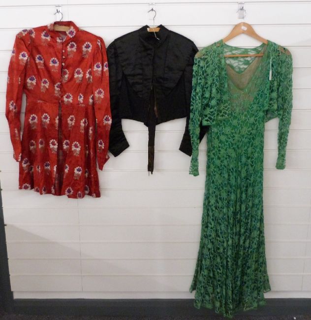 Art Deco green silk dress, woven silk floral jacket and a black jacket