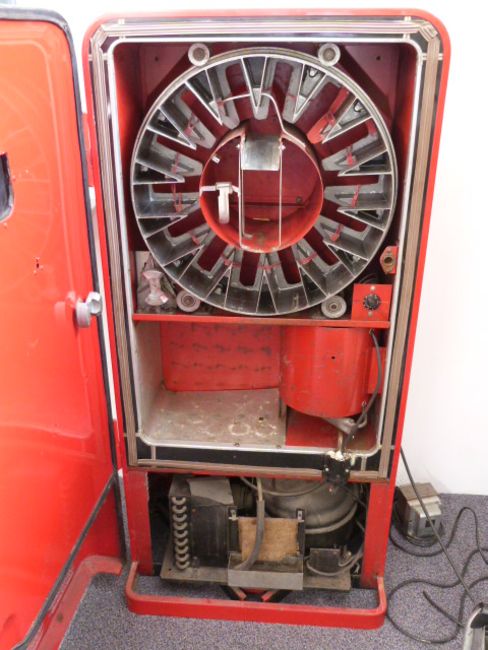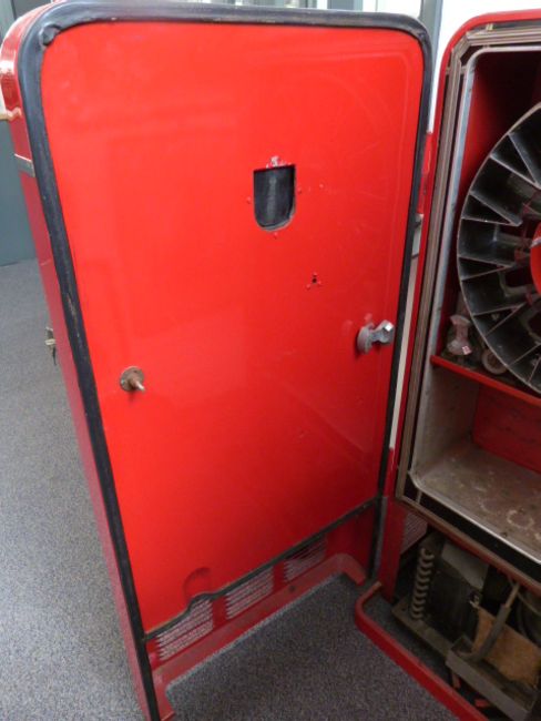 American mid century/ retro VMC Vendorlator refrigerated vending machine, circa 1950, with 'Drink Coca-Cola, Delicious and Refreshing' decal above a lever operated mechanism. The back with original wheels and pull bar to maneuver the machine, serial numbers to the side plate including 27A- 15283, 115, 60 etc, some numbers indistinct. Comes with complete spare component and keys, W64 x D53 x H133cm