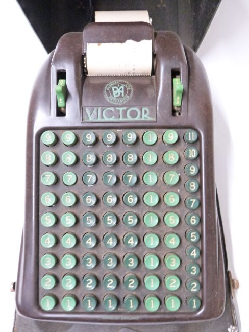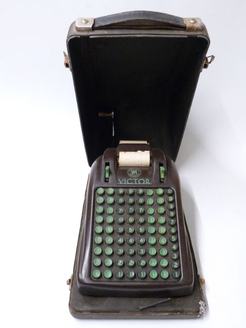 Victor mechanical calculator with Business Aids mechanised logo to top, numbered B/5960 to underside and with Black & Anderson plaque, in original metal travel case