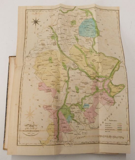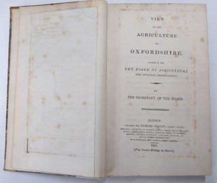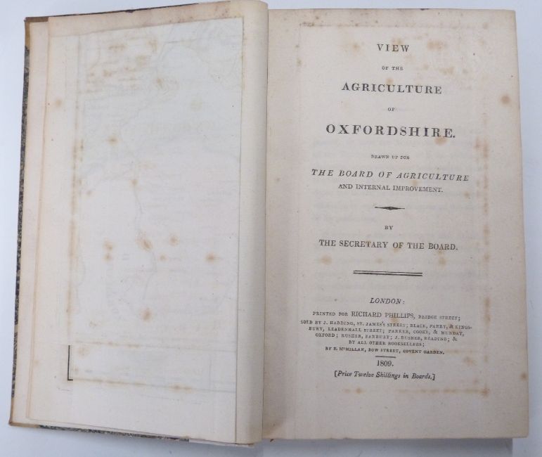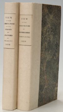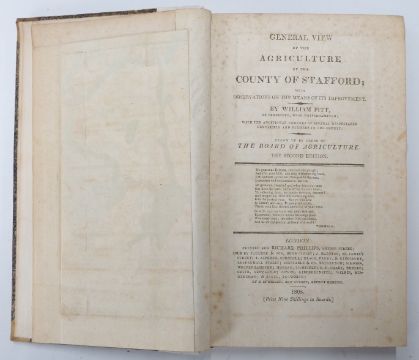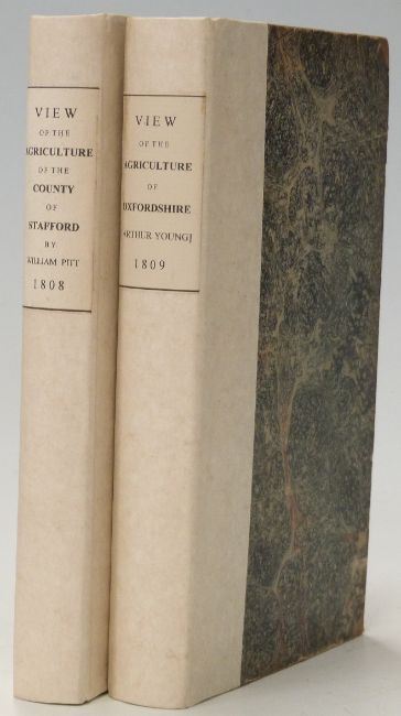 William Pitt General View of the Agriculture of the County of Stafford with View of The Agriculture of Oxfordshire by Arthur Young printed for Richard Phillips 1808 & 1809 folding coloured map each volumes and numerous engraved plates & diagrams (some folding) marbled boards with vellum spines & printed labels
