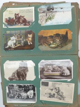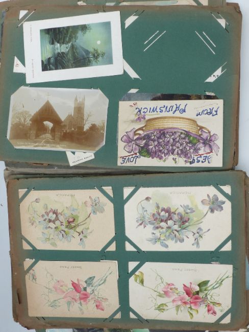 Several albums of early 20th century postcards to include Painswick, Reading, Swindon, Brighton, 1908 Franco-British exhibition, Methwold, Eastborne. Swindon tram accident, Weston-Super-Mare, cats, tram at Woolwich, Cirencester, Walter Hellman suffragette card and 1 V.B. Gloucester regiment, West Lulworth 1907, houseboats at Henley Regatta, humorous, romantic, Gibraltar, Nailsworth, Huntley and Palmers, Dawlish, steam engine Experiment' Pears Soap Painswick advertising card, HMS Apollo, Ross on Wye, Edwardian stars of stage and screen, Swindon, further Painswick advertising cards, some possibly Bespoke including Pears Soap, approximately 320 plus cards