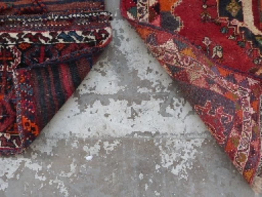 Handmade woollen rug on red ground, 150 x 120cm together with a similar pouch