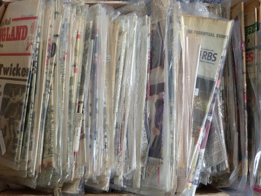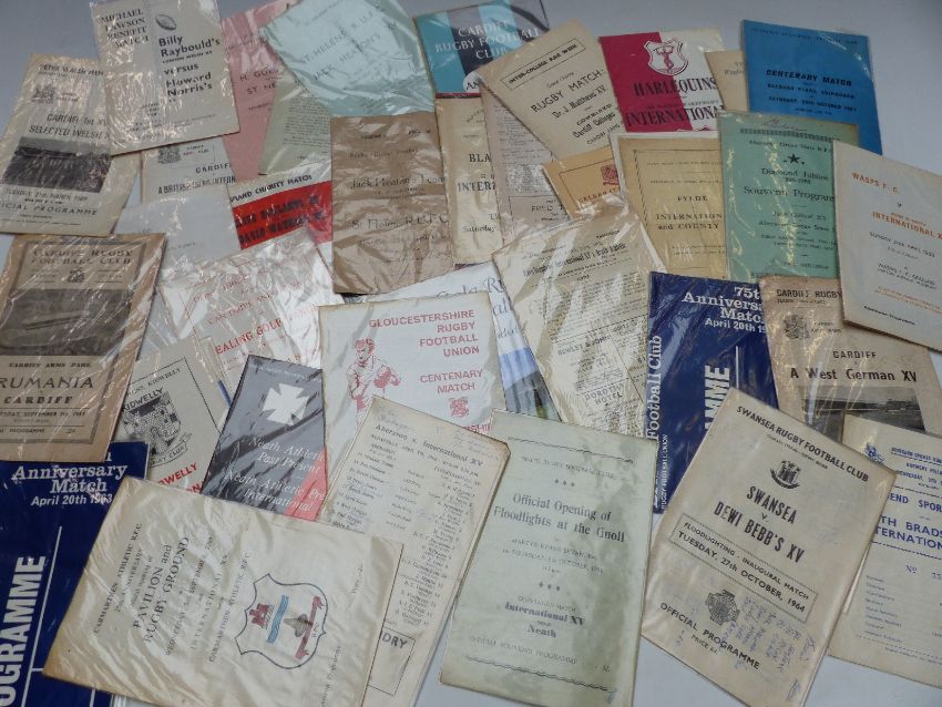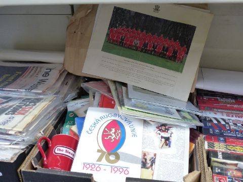 A large quantity of rugby memorabilia to include programmes for Gloucestershire Rugby Football Union centenary match, 75th Anniversary Cardiff programme, 1930's Jack Heaton's team vs St Helen's and other 60's, 70's, 80's and 90's programmes. Also included are an autograph book featuring Cardiff, Barbarians and other players together with Welsh RFU items including VHS and posters