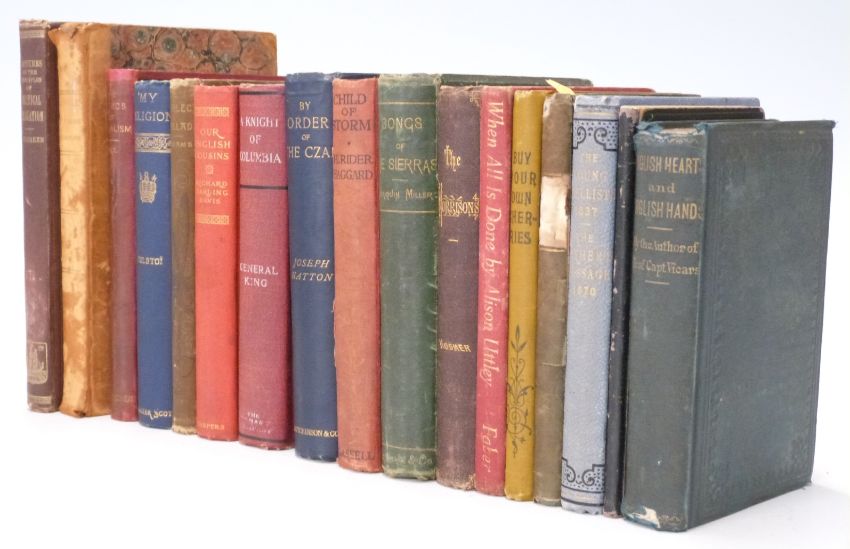 Nineteenth Century books inc The Young Duellists 1837, Bound volume of Addresses & Discourse on The Bunker Hill Monument, The Massachusetts Peace Society, A Sermon delivered before Levi Lincoln (1820s), and others on Socialism, The Czar 1890, Tolstoy 1889, Songs of the Sierras 1871, Poems by Roswell Park 1836, H. Rider Haggard (17)
