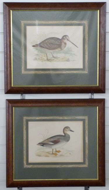 Two coloured etchings of birds, one of Woodcock the other Gadwall, both in bird's eye maple frames
