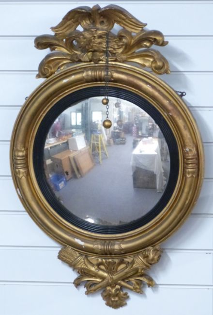 Regency giltwood framed mirror with convex glass and eagle to top, H85cm
