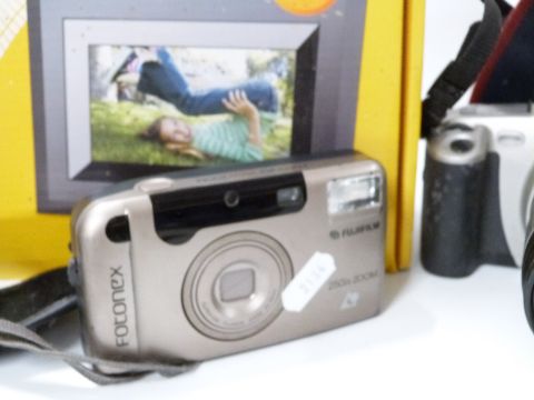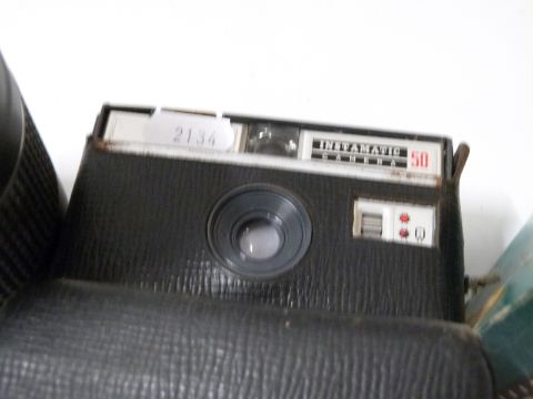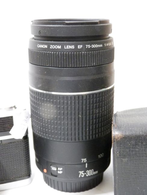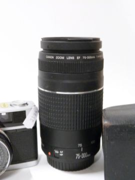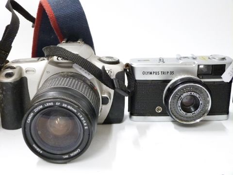 A collection of vintage cameras and home movie equipment to include Olympus Trip 35, Canon EOS 300 and lens, Canon EF 75-300mm f/4-5.B lens, Kodak movie camera etc