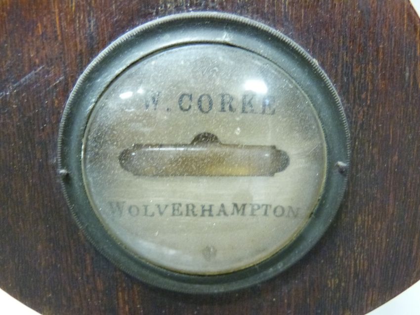 W Corke, Wolverhampton, 19thC mahogany barometer, the silvered dial with points of the compass-style centre and pierced hands, the brass thermometer above surmounted by a silvered hygrometer dial