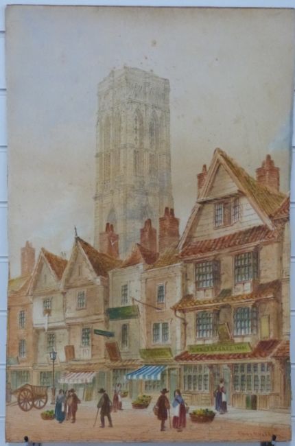 Paul Braddon watercolour cathedral beyond a street including the Shakespeare Inn, signed lower right