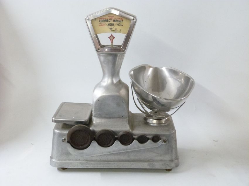 Vandome & Hart Ltd London aluminium shop scales with rack of Crane weights