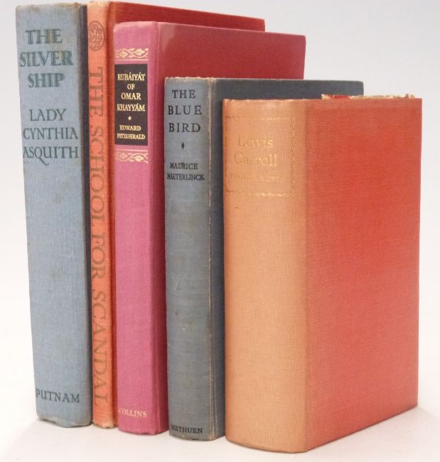 The Silver Ship by Lady Cynthia Asquith Putnam 1932 coloured front and black & white illustrations, The Blue Bird by Maurice Maeterlinck with coloured plates by E. Cayley Robinson in pictorial cloth, Lewis Carroll Complete Works illustrated by John Tenniel, Nonesuch Press 1939, Rubaiyat of Omar Khayyam illustrated by Sherriffs, The School for Scandal with designs by Cecil Beaton 1949 (5)