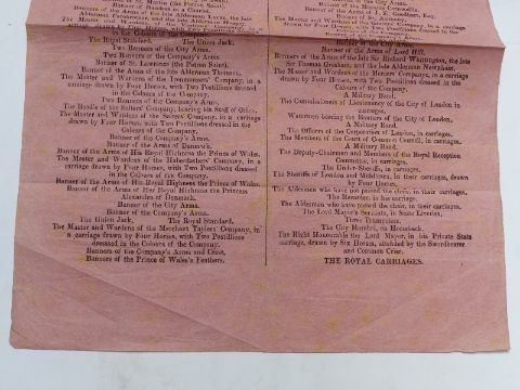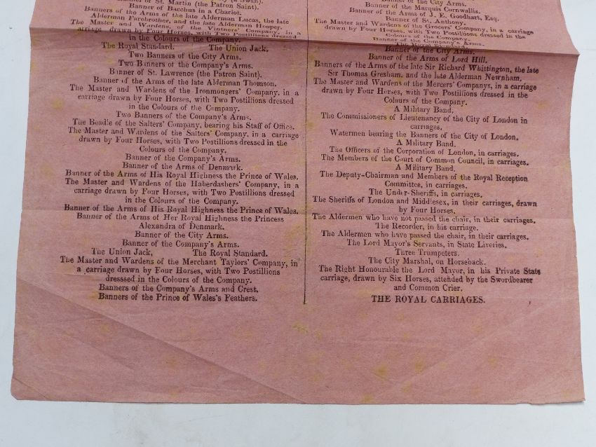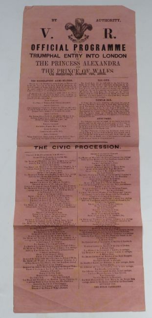 A Victorian handbill or official programme of the triumphal entry into London of the Princess Alexandra and the Prince of Wales on Saturday, March 7th, 1863, giving a list and order of dignitaries/royalty in each carriage and the route followed. The second part relates to the civic procession and the order, colours, banners and type of carriages etc