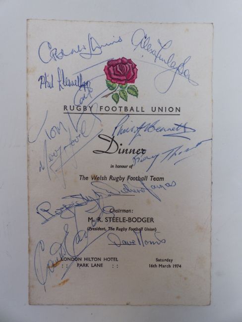 Wales Rugby Football Union menu 16th March 1974 signed by 'the Invincible Team' including Gareth Edwards, Phil Bennett, Gerald Davies, J J Williams etc, approximately 19 signatures