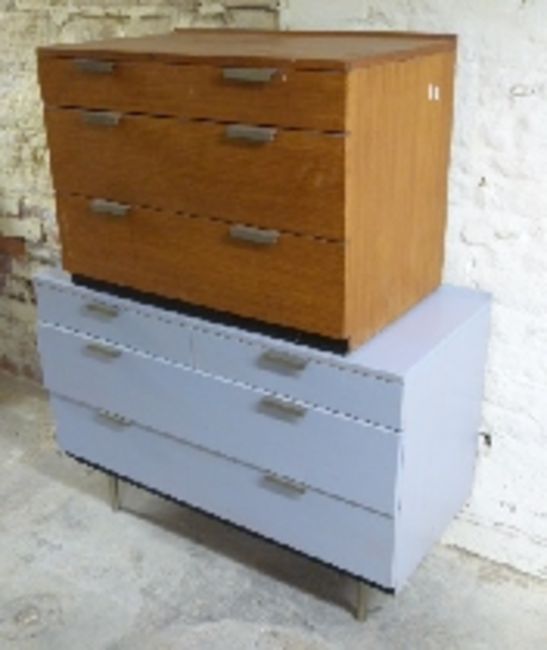 A painted chest of three drawers and a similar smaller teak example, largest W102 x D46 x H70cm