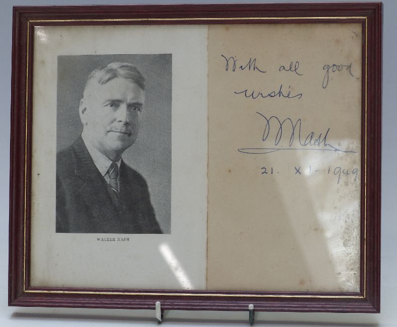 Framed book frontispiece signed and dated 1949 by Walter Nash, later Sir Walter Nash,1882-1968, Prime Minister of New Zealand 1957-1960, 20 x 25cm