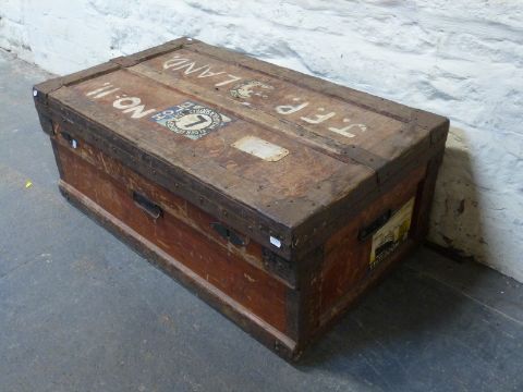 A wooden steamer or travelling trunk with vintage Elder Dempster Lines labels and metal corners, W91 x D60 x H39cm