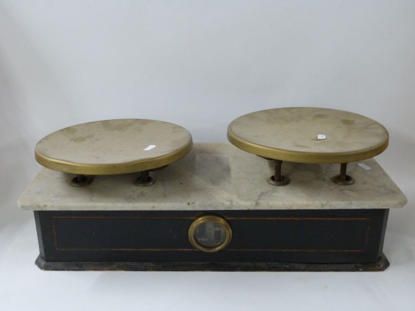 19thC shop scales with brass pans and marble top