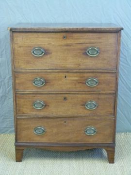A George III mahogany secretaire with leather inset fall flap revealing a fitted interior over three graduated drawers, raised on slender bracket feel, W78 x D48 x H102cm