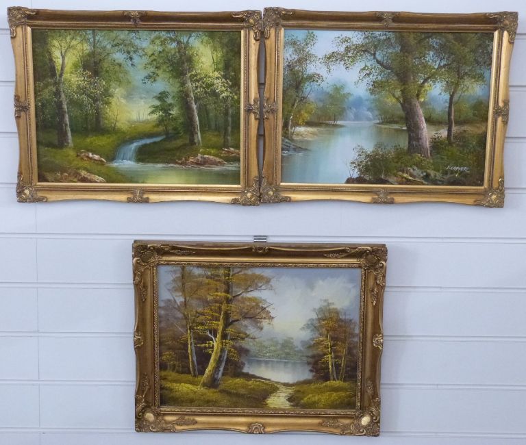Three framed oil on canvas paintings of trees around lakes (30 x 40cm) together with an oval framed mirror