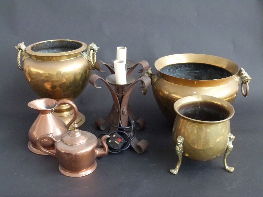 Brass jardinieres and copper items including jug, kettle etc