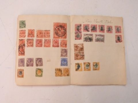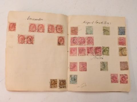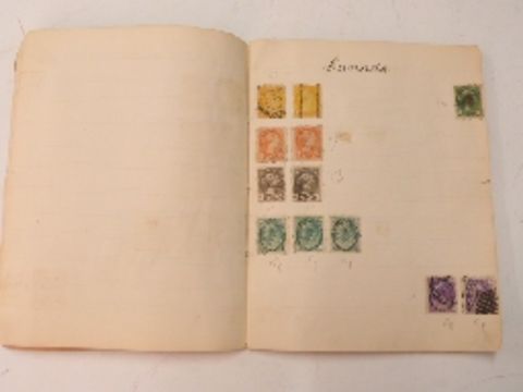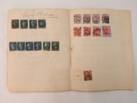 An exercise book of GB and Commonwealth stamps including strip of four 1841 1d red brown, 1841 2d blues and strip of four 1858 2d blue