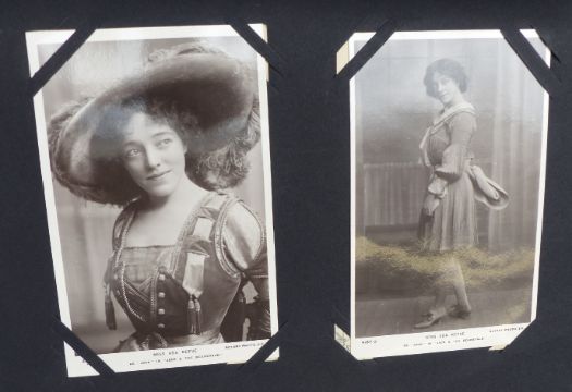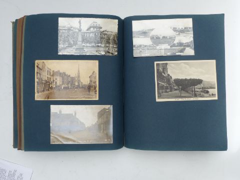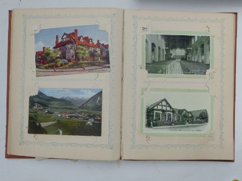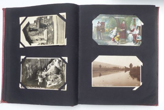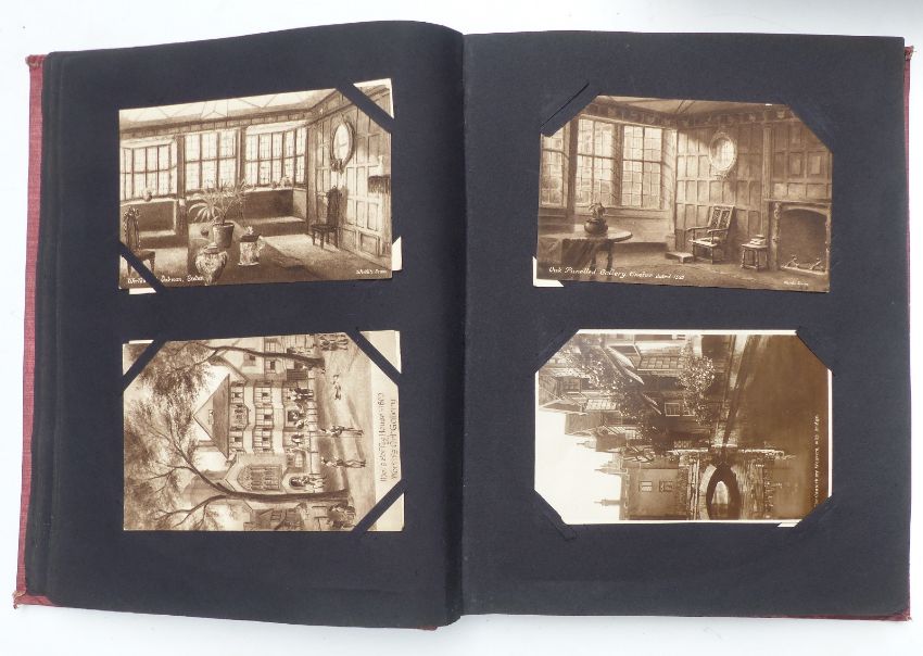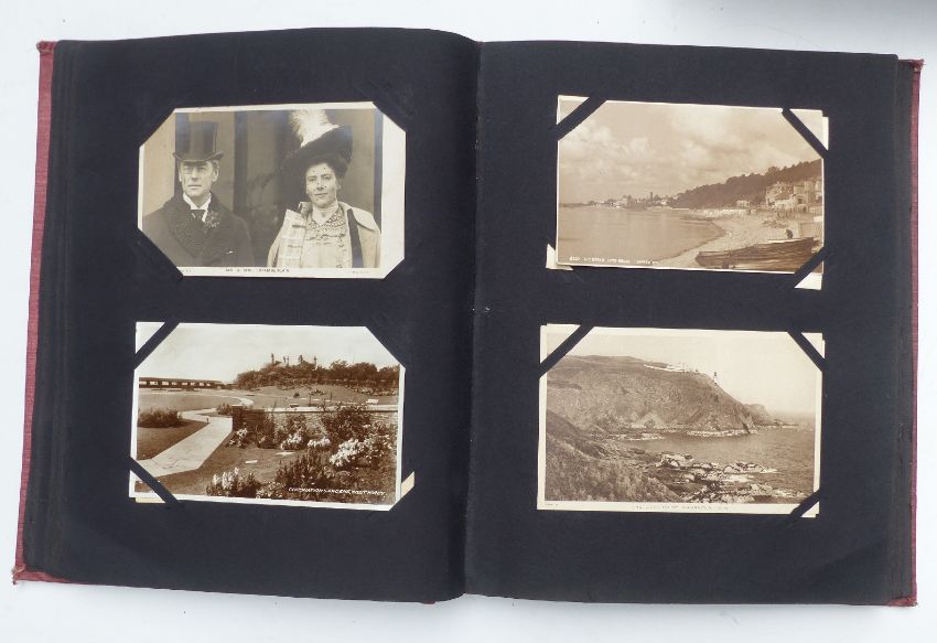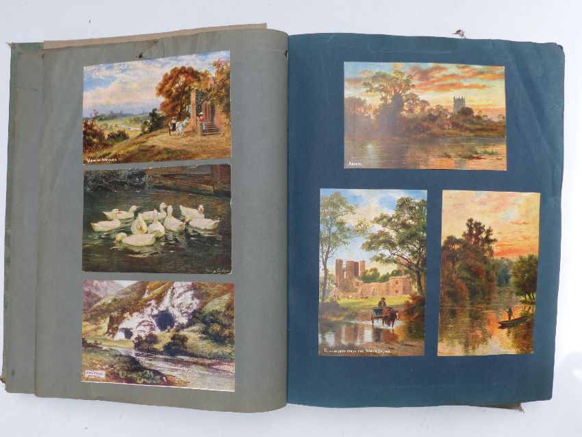 Three Edwardian and later postcard albums, the first includes Gloucester, Chalford, Tewkesbury, Malvern & Porlock, seven Louis Wain cards, four of Vesuvius errupting, three Bruce Bairnsfather, 104 plus cards in total. The second album dated 1904 includes Longfords Lake Stroud Valley, Woodchester, continental scenes, Gerrards, Cross, Llangollen canal, Mabel Lucie Attwell, Bruce Bairnsfather, Weston Super Mare, Kewstoke etc approximately 140 in total. The last album dated 1905 includes Lake District, Derbyshire, Irish scenes, Llangollen canal, Hoylake, Liverpool, Surrey, Dartmouth, Gloucester & Cheddar, approximately 240 cards, so approximately 480 cards in all