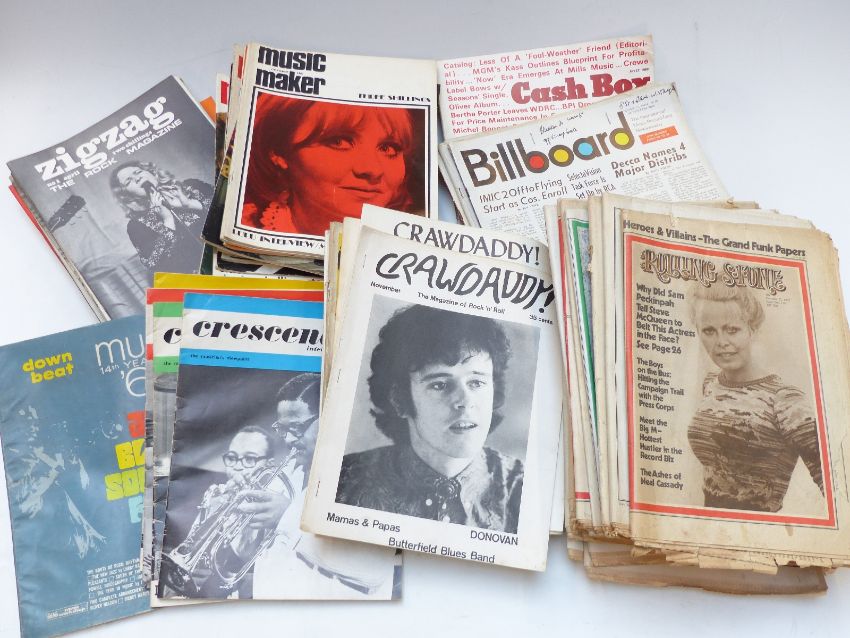 Eighteen issues of Rolling Stone mainly from 1968/69, five issues of Crescendo from 1967, 4 issues of Billboard, 13 issues of Crawdaddy including issue 6, 18 issues of Zig Zag
