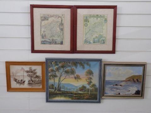 Mary Kershaw oil on board coastal landscape 'Stoerpoint', oil on canvas landscape, two reproduction maps etc